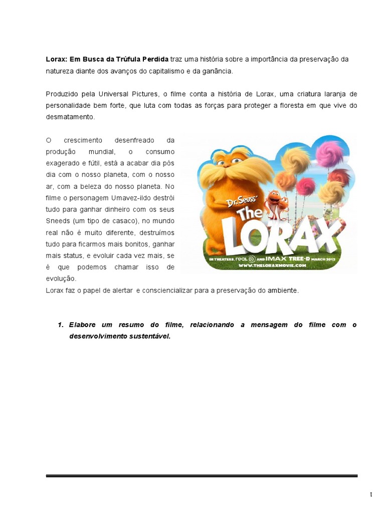 Atividade Sobre O Filme Lorax, Vídeo aula da atividade do filme: Lorax - Projeto Meio Ambiente 14-09-2020, 5.24 MB, 03:49, 53, Colégio Interação, 2020-09-14T22:53:28.000000Z, 3, Ficha Lorax, pt.scribd.com, 768 x 1024, jpeg, WebO Lorax: Em Busca da Trúfula Perdida Quizzes de O Lorax: Em Busca da Trúfula Perdida Quizzes do filme O Lorax: Em Busca da Trúfula Perdida (THe Lorax) que foi lançado em. WebO menino Ted (Zac Efron) descobriu que o sonho de sua paixão, a bela Audrey (Taylor Swift), é ver uma árvore de verdade, algo em extinção. Disposto a., 20, atividade-sobre-o-filme-lorax, Ciência popular e notícias WebO Lorax: Em Busca da Trúfula Perdida Quizzes de O Lorax: Em Busca da Trúfula Perdida Quizzes do filme O Lorax: Em Busca da Trúfula Perdida (THe Lorax) que foi lançado em. WebO menino Ted (Zac Efron) descobriu que o sonho de sua paixão, a bela Audrey (Taylor Swift), é ver uma árvore de verdade, algo em extinção. Disposto a.