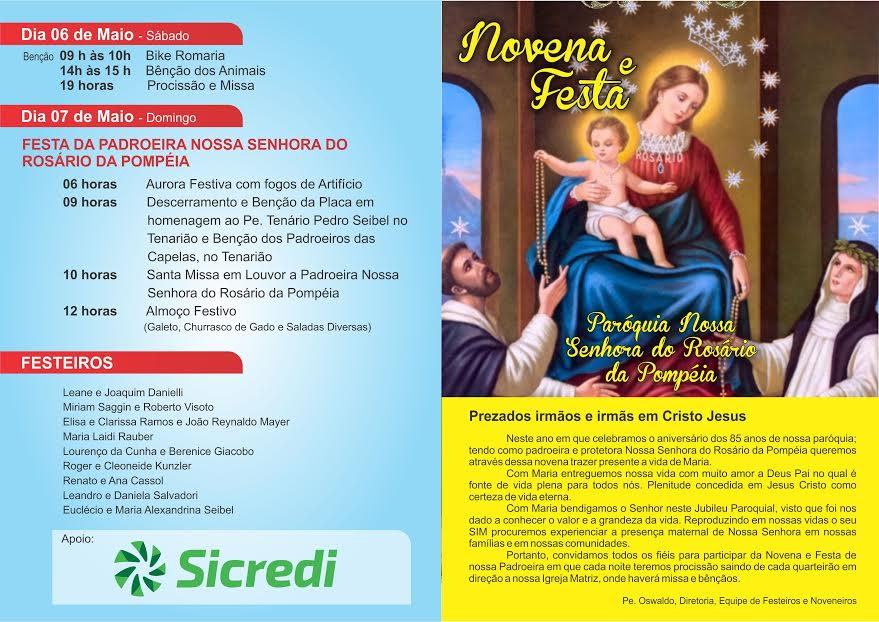 WebA “Novena a Nossa Senhora do Rosário de Pompéia” elaborada pelo Bem Aventurado Bartolo Longo, em 1879, deve ser rezada três vezes em seguida, para implorar graças. WebNovena à Nossa Senhora do Rosário de Pompéia 34º Dia 7º da segunda parte Oração e Milagre 1.39K subscribers Subscribe 0 No views 6 minutes ago Mil graças rendo a Deus.